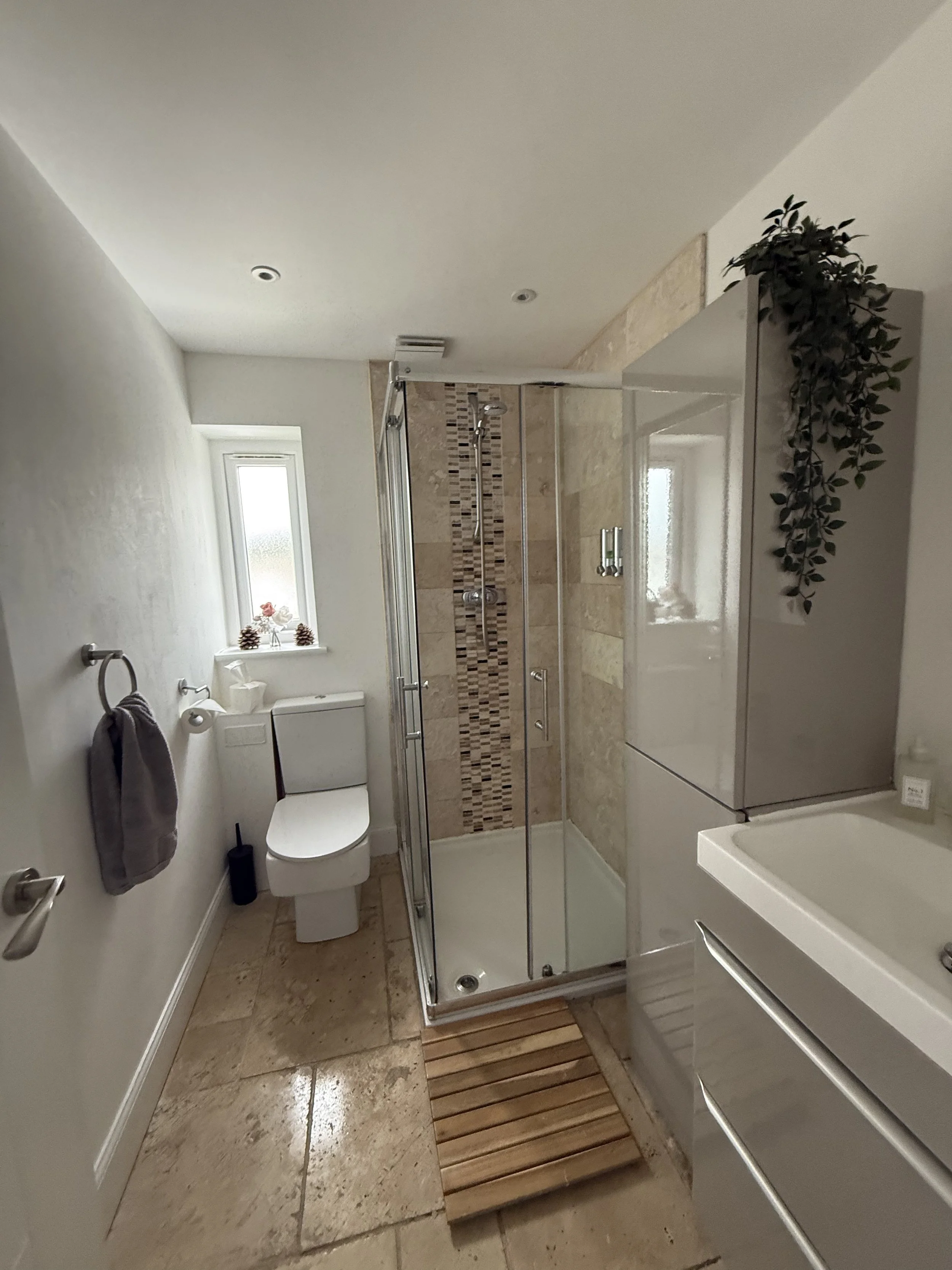 Modern bathroom with shower, toilet, sink, and small window, decorated with beige tiles and greenery.