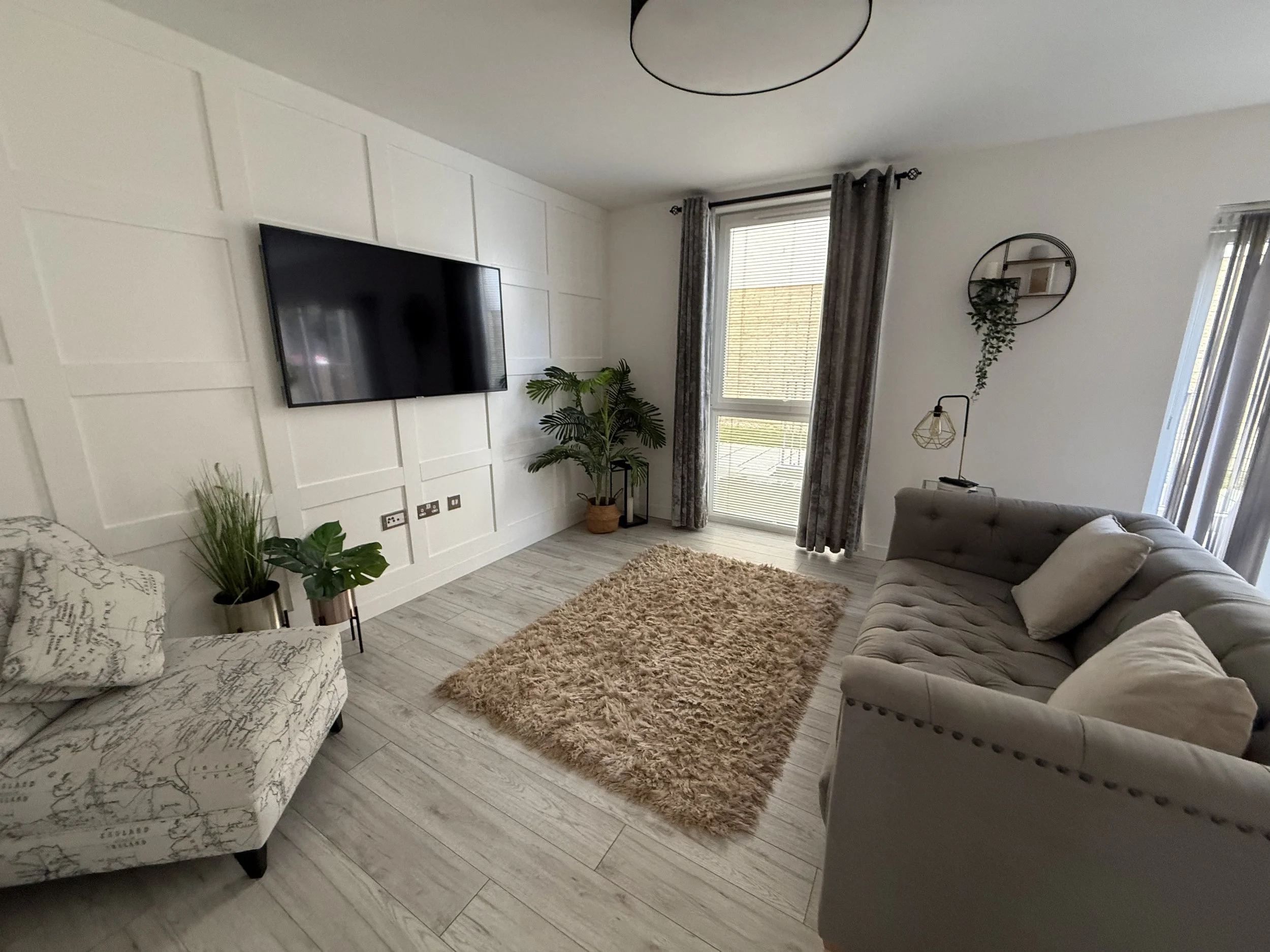 Living room with a beige tufted sofa, a patterned armchair, a shaggy beige rug, a wall-mounted TV, and various potted plants, with large windows and modern decor.