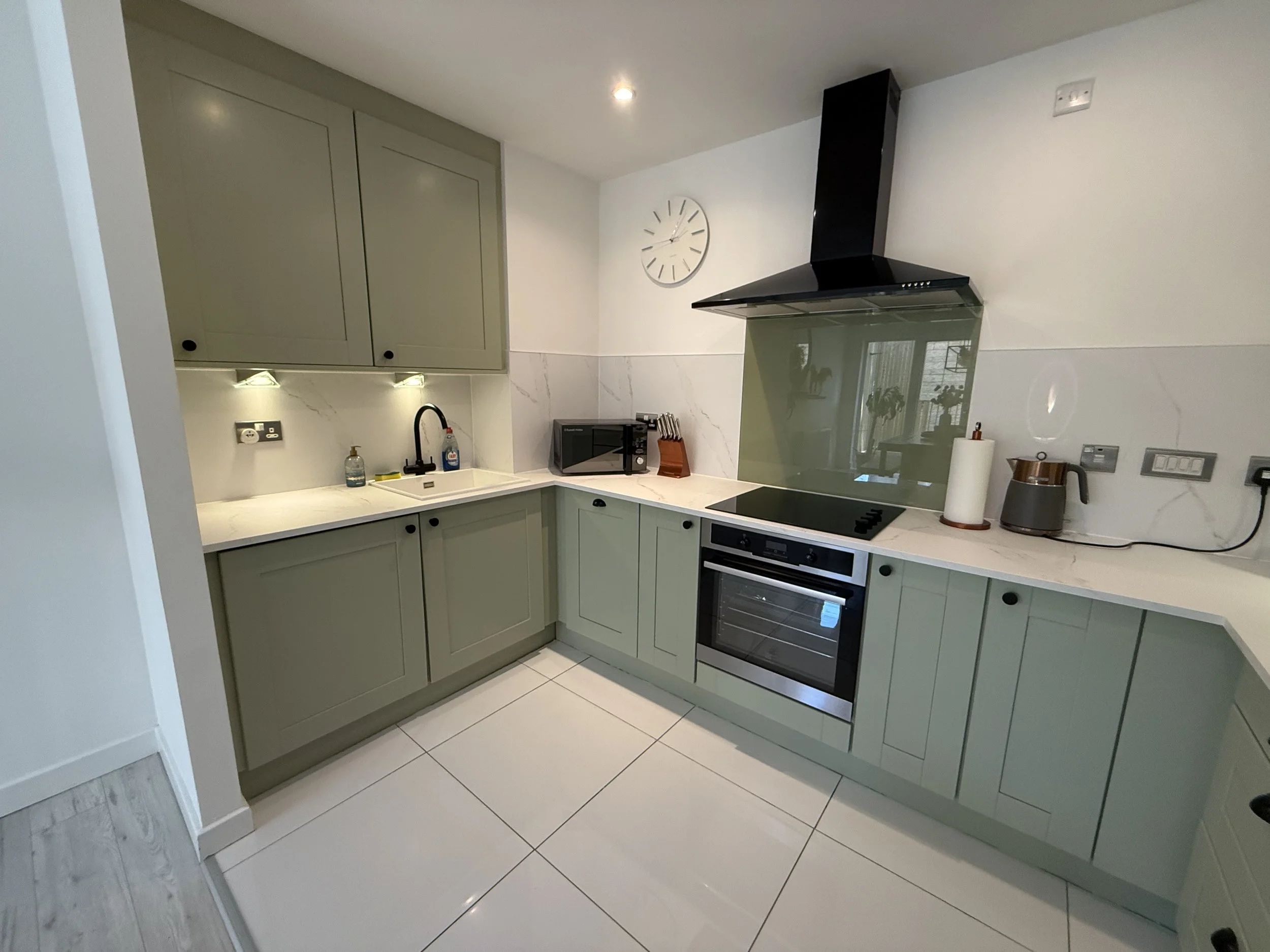 Modern kitchen with light green cabinets, white marble countertops, black stove and oven, black range hood, stainless steel microwave, and various small appliances on the counter.