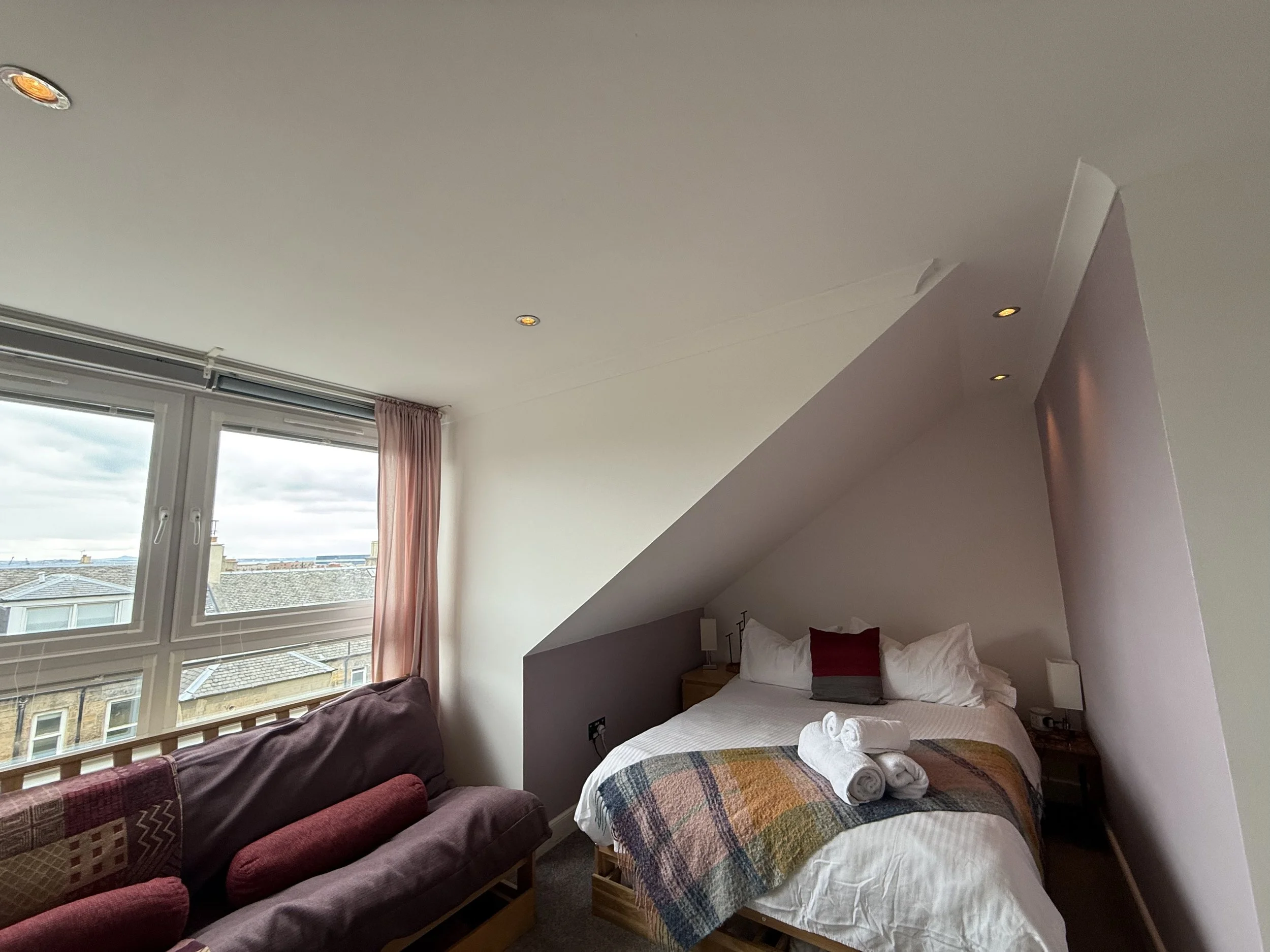 A cozy bedroom with a sloped ceiling, featuring a bed with white linens, a plaid blanket, and towels, a side table with a lamp, a window with pink curtains, and a purple armchair.