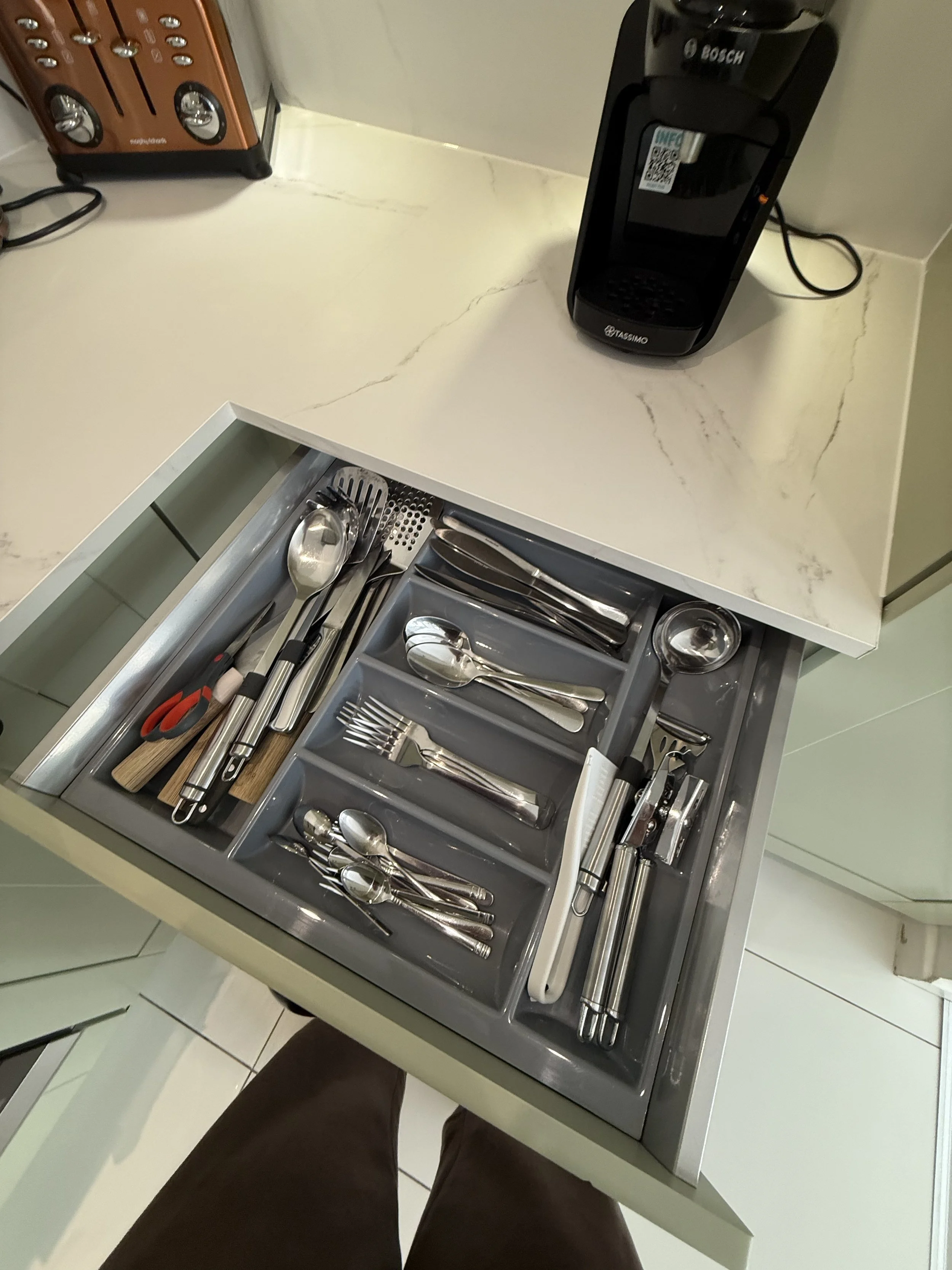 Kitchen drawer open with various utensils including cutlery, scissors, and kitchen tools, with a coffee machine on a marble countertop in the background.