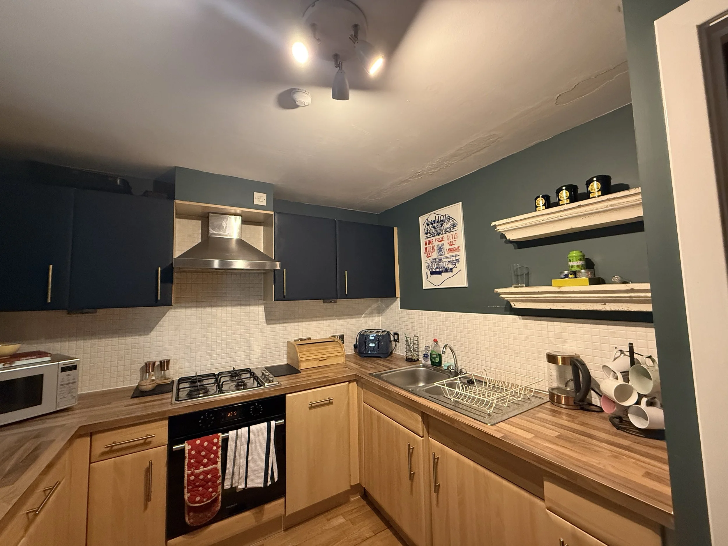 Kitchen with wooden countertops, blue upper cabinets, a stainless steel range hood above a stove, white tiled backsplash, microwave, toaster, kettle, hanging mugs, shelves, and various kitchen items.