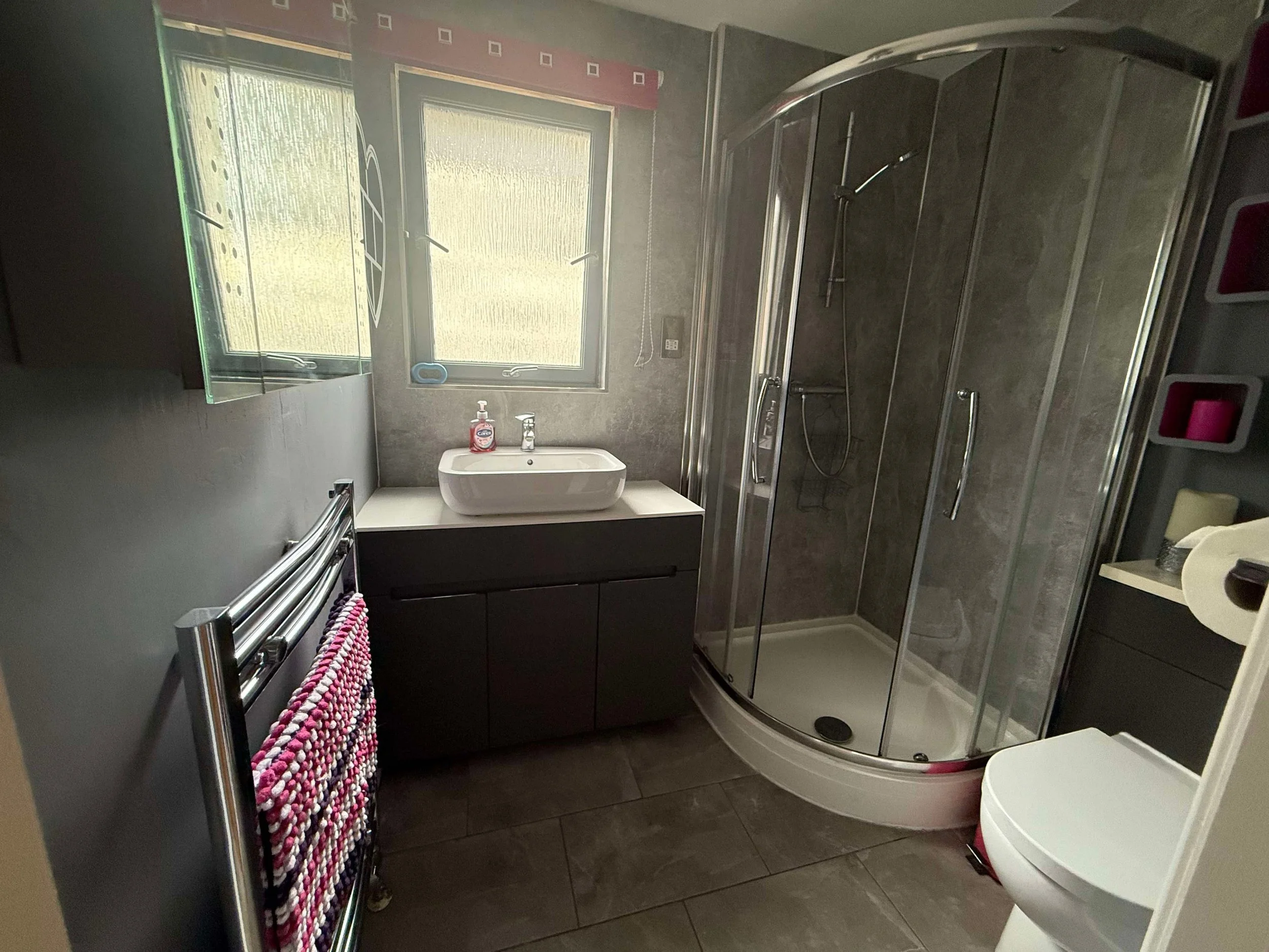 Modern bathroom with gray walls, a frosted window, a white sink on a dark cabinet, a glass-enclosed corner shower, a white toilet, and a chrome towel rack with a pink and white towel.