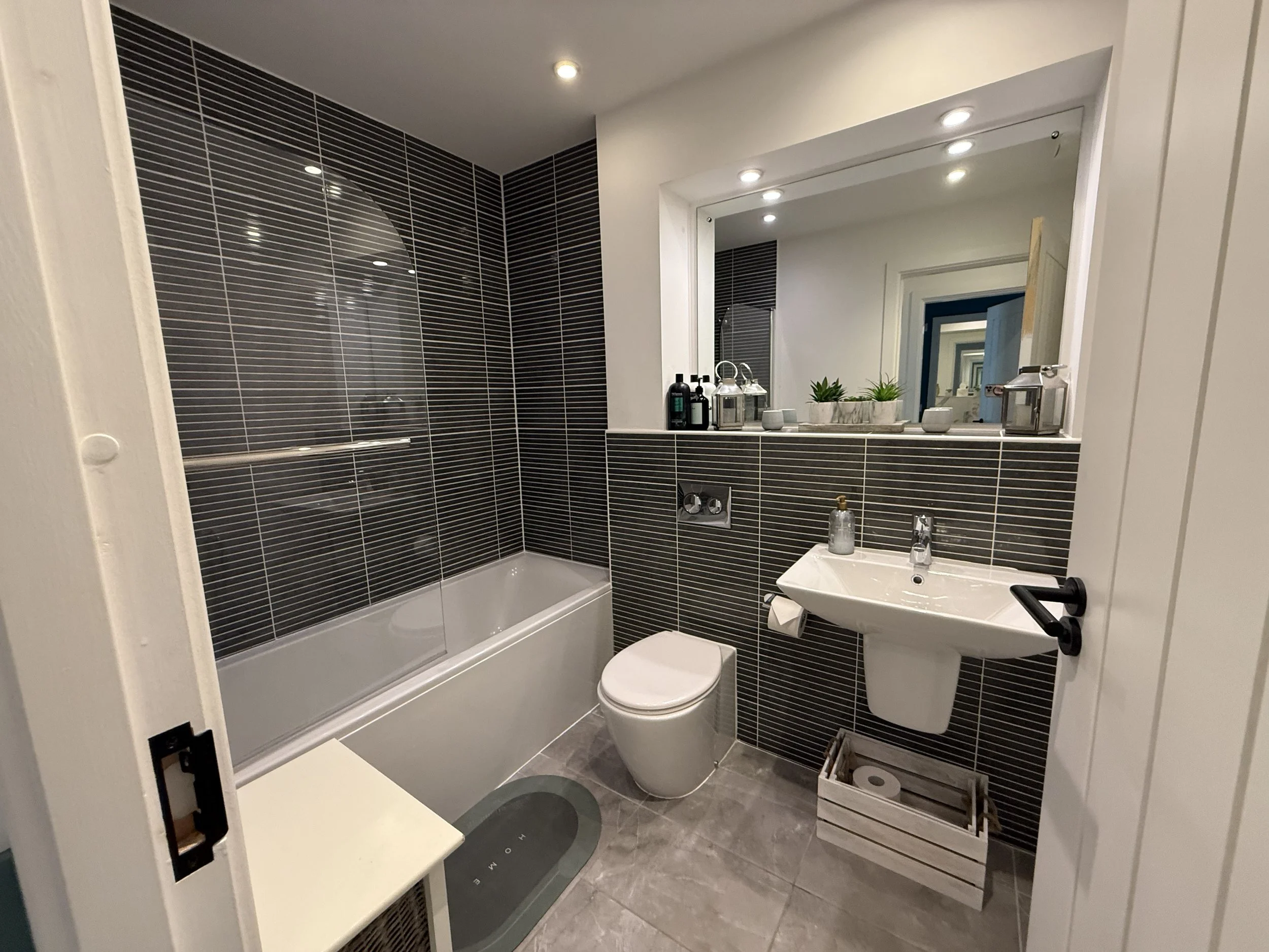 Modern bathroom with a bathtub, a white toilet, a wall-mounted sink, a large mirror, and black horizontal striped tiles on the wall.