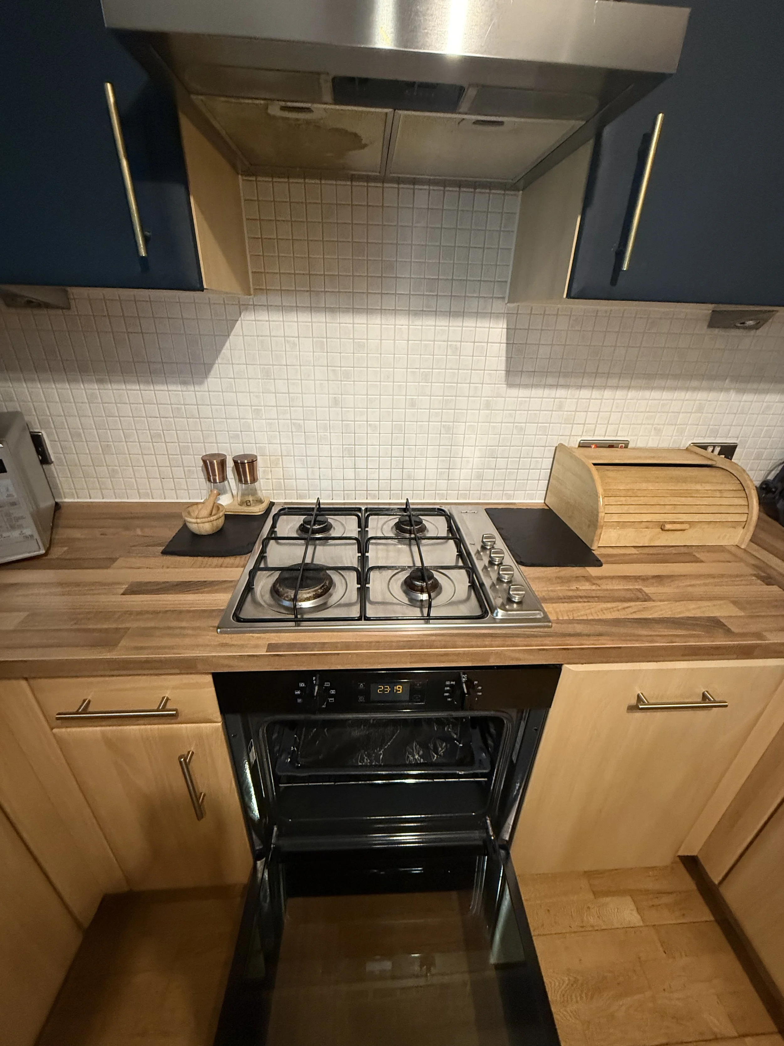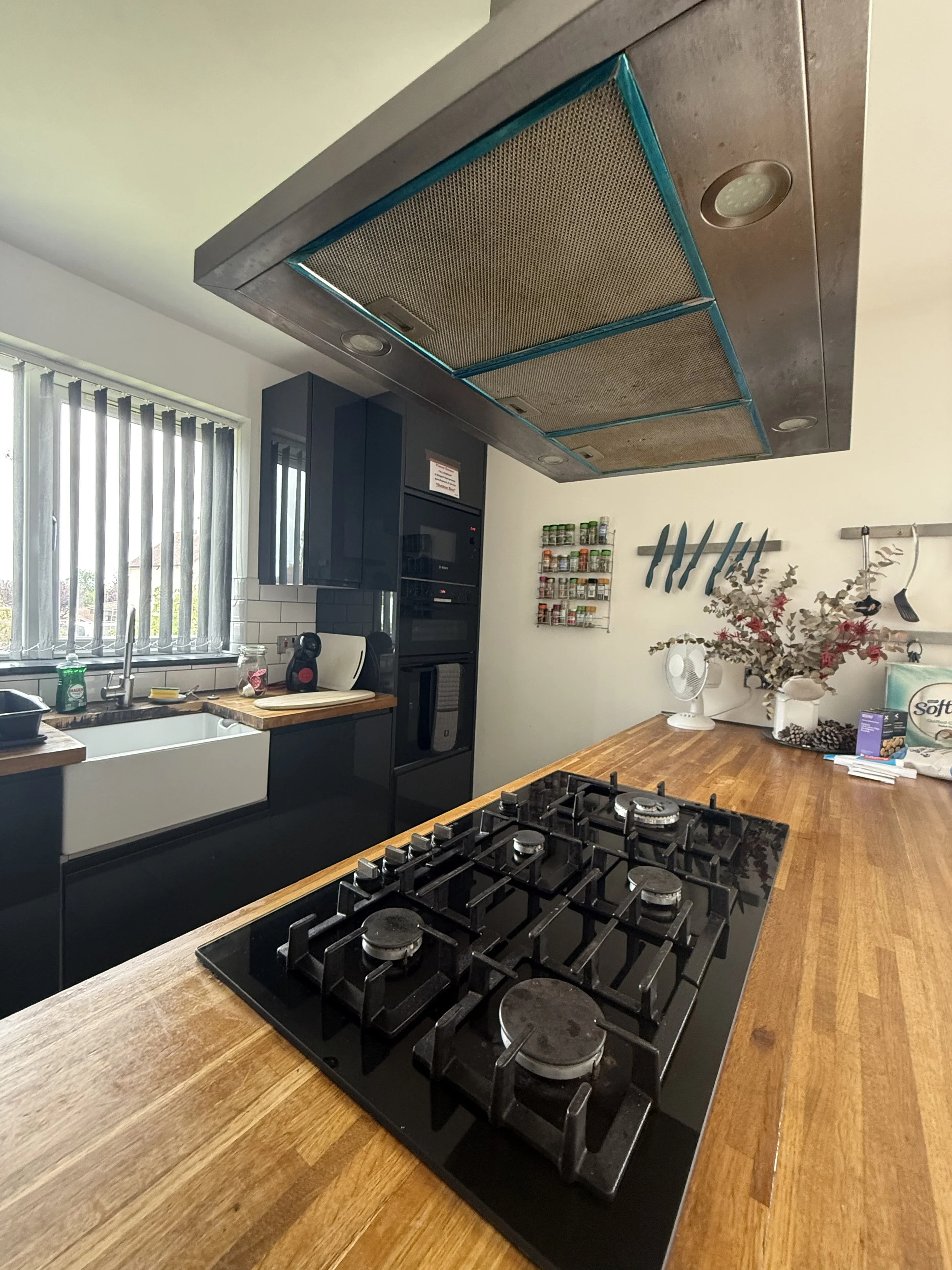 Black gas cooktop with four burners and control knobs on a wooden countertop.