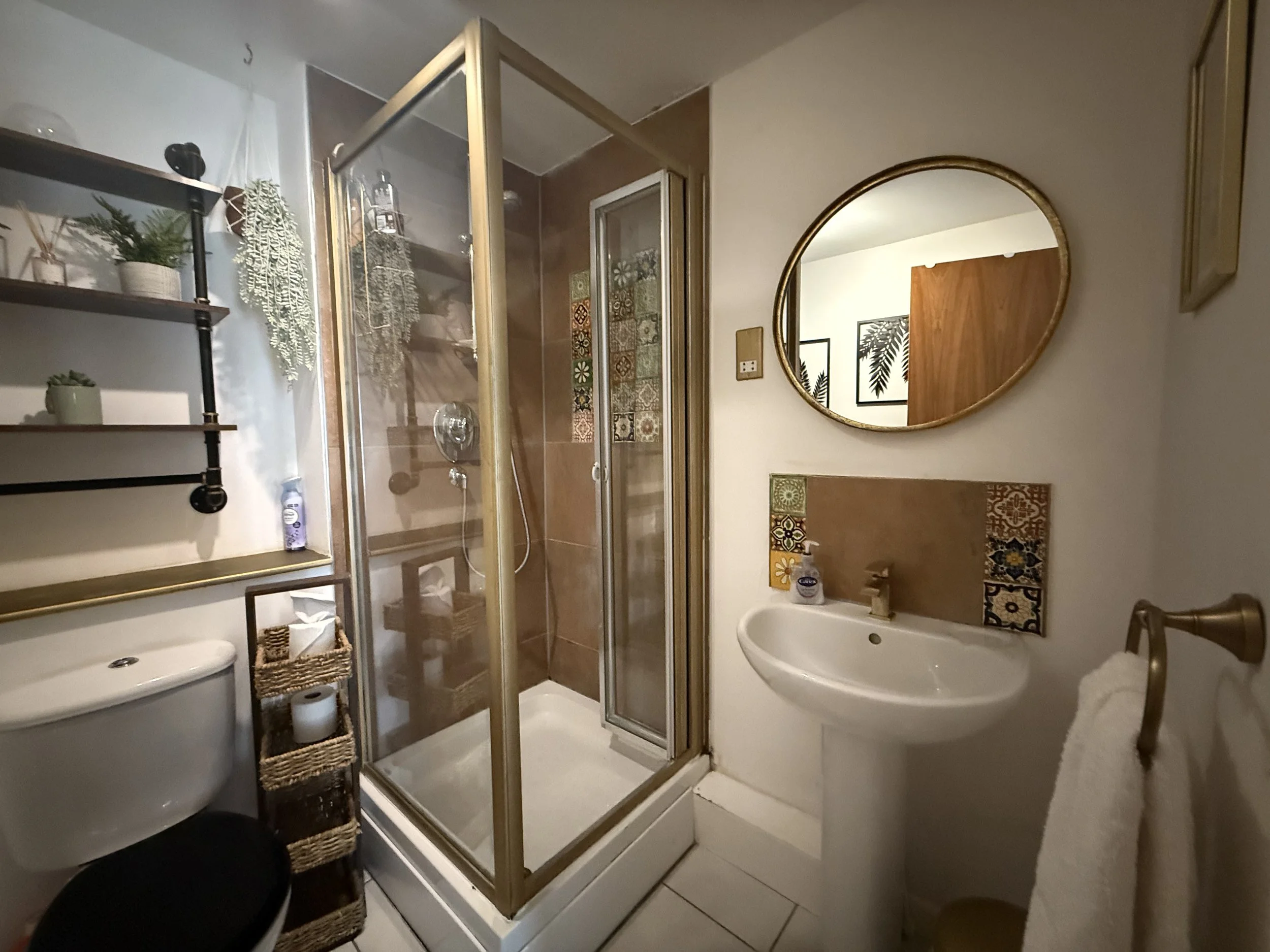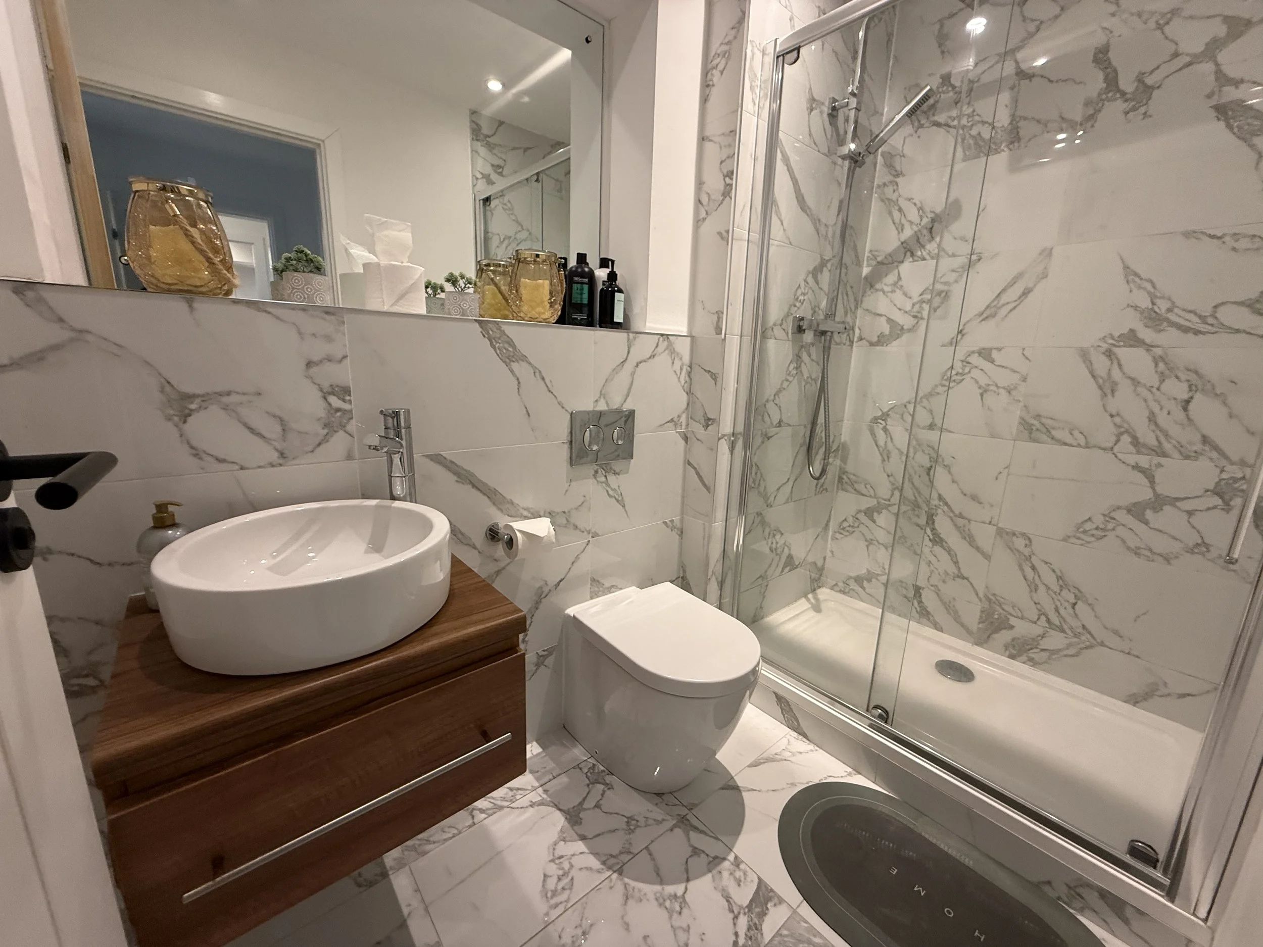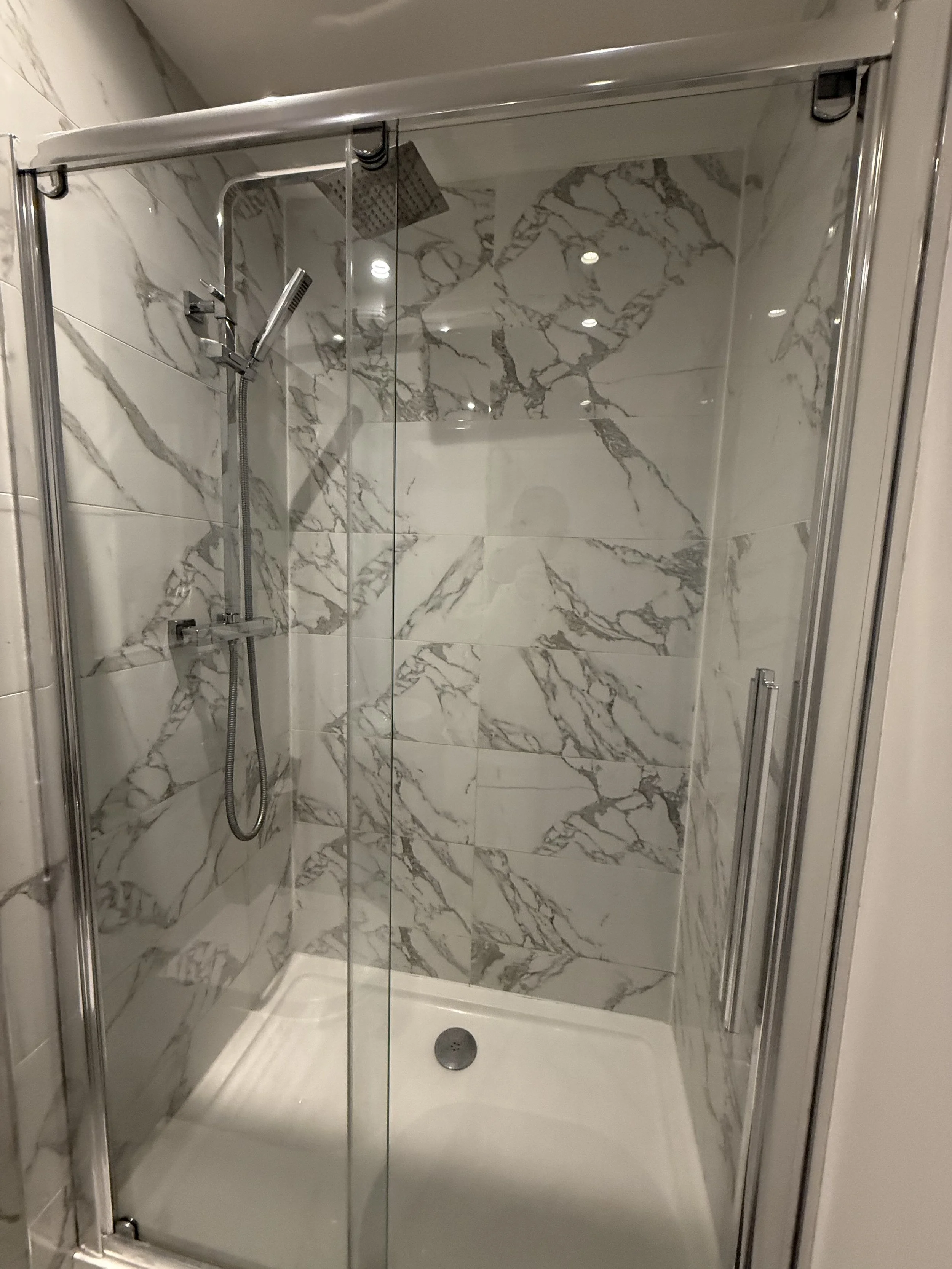 A tiled shower with marble-patterned walls, a handheld showerhead, and a glass door.