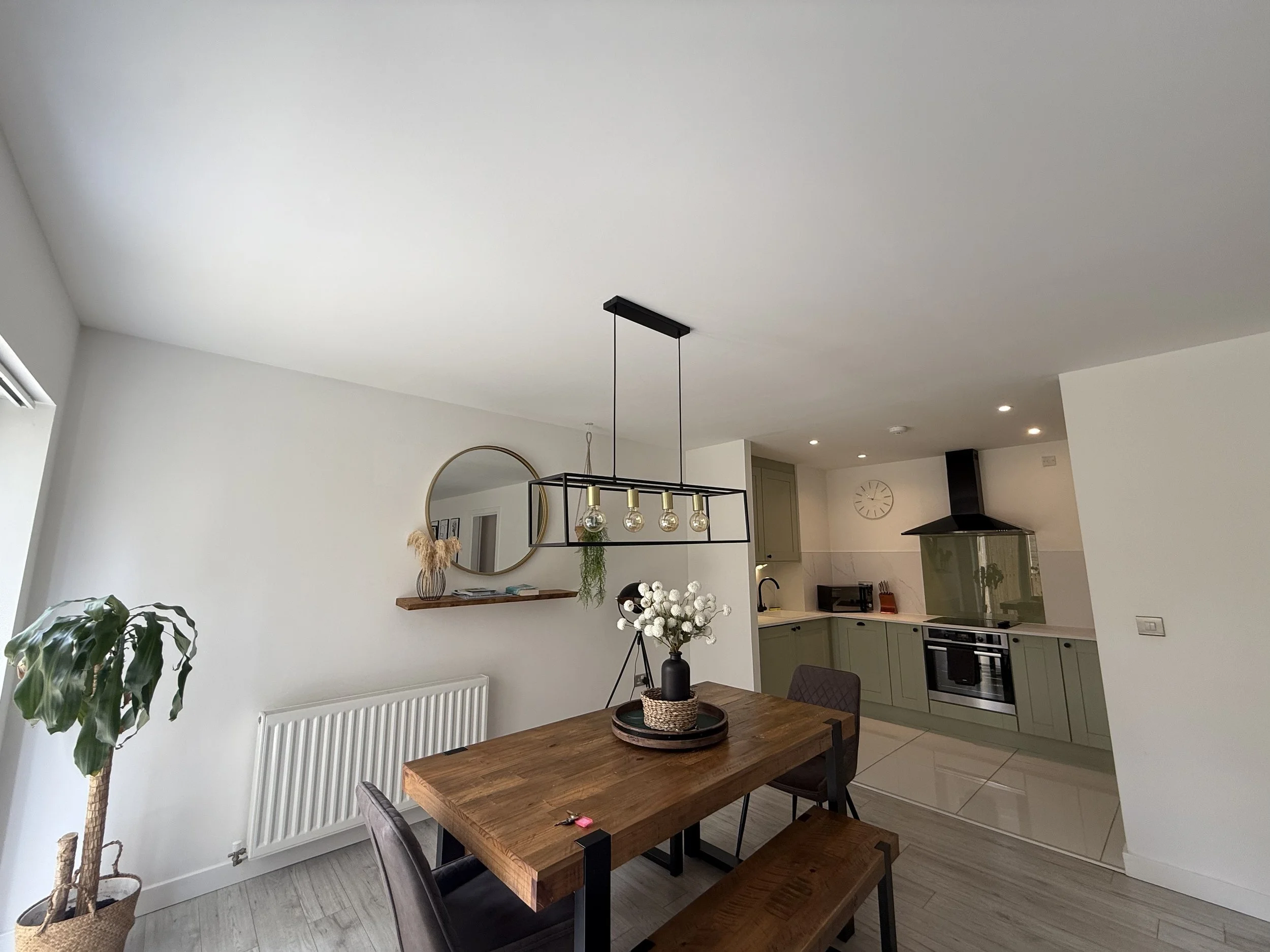 Modern open-concept kitchen and dining area with a wooden table, black chairs, olive-green kitchen cabinets, black appliances, and decorative items like a mirror, mirror, floating shelf with a vase, and a clock.