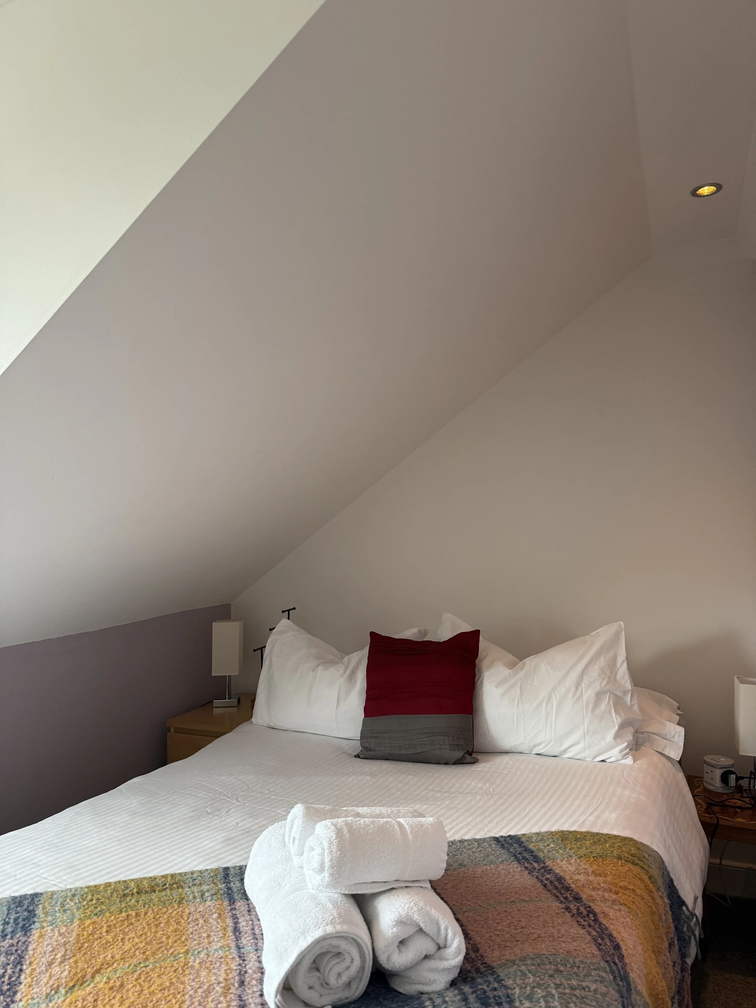 A neatly made bed with white pillows, a red and gray decorative pillow, and a colorful plaid blanket, with towels rolled on top, in a cozy bedroom with sloped ceiling and bedside lamps.