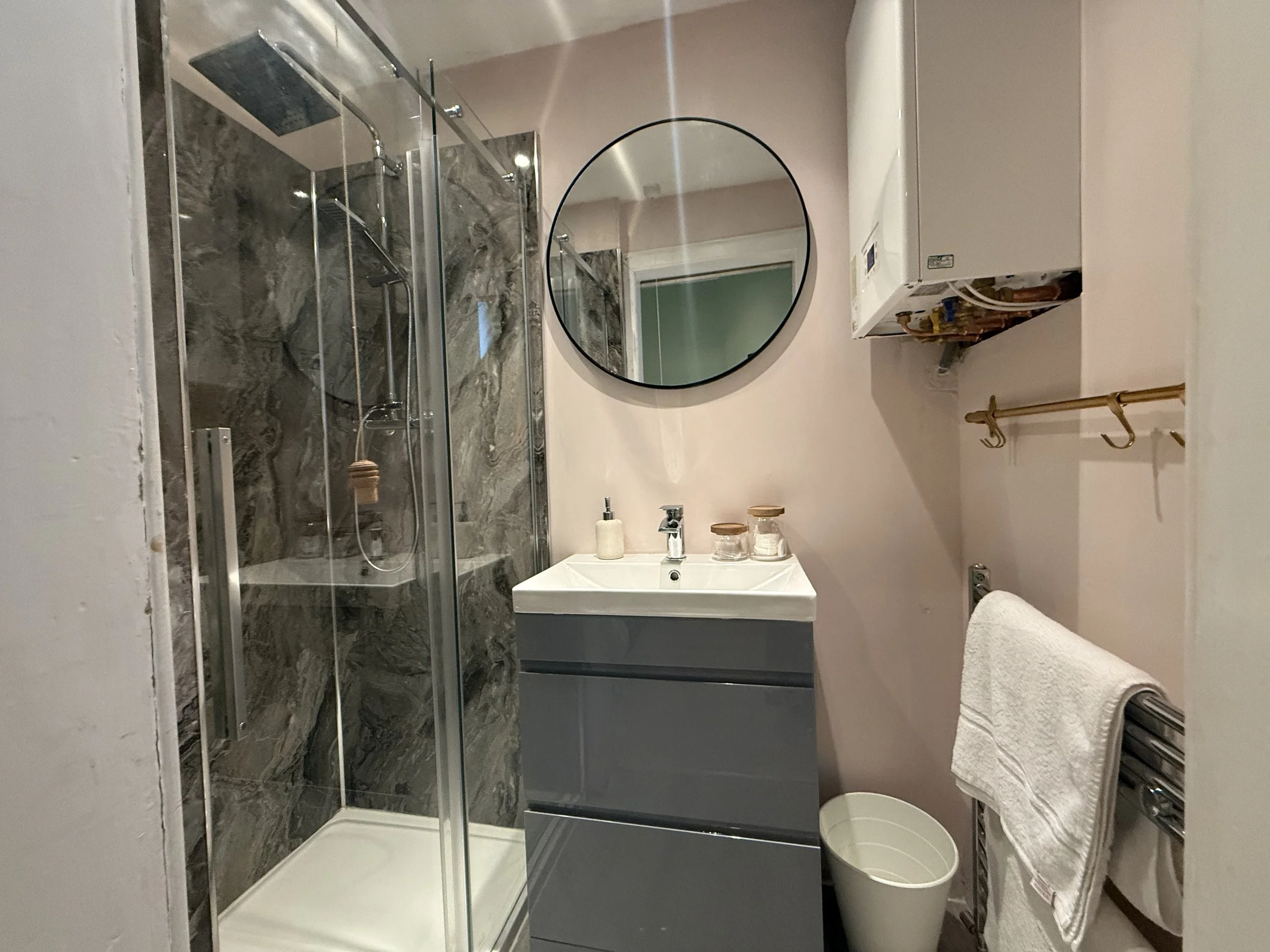 A compact bathroom with a glass shower enclosure, a round mirror above a grey vanity, a white wall-mounted boiler, a towel rack with a white towel, a small white trash bin, and some toiletries on the vanity and shelf.