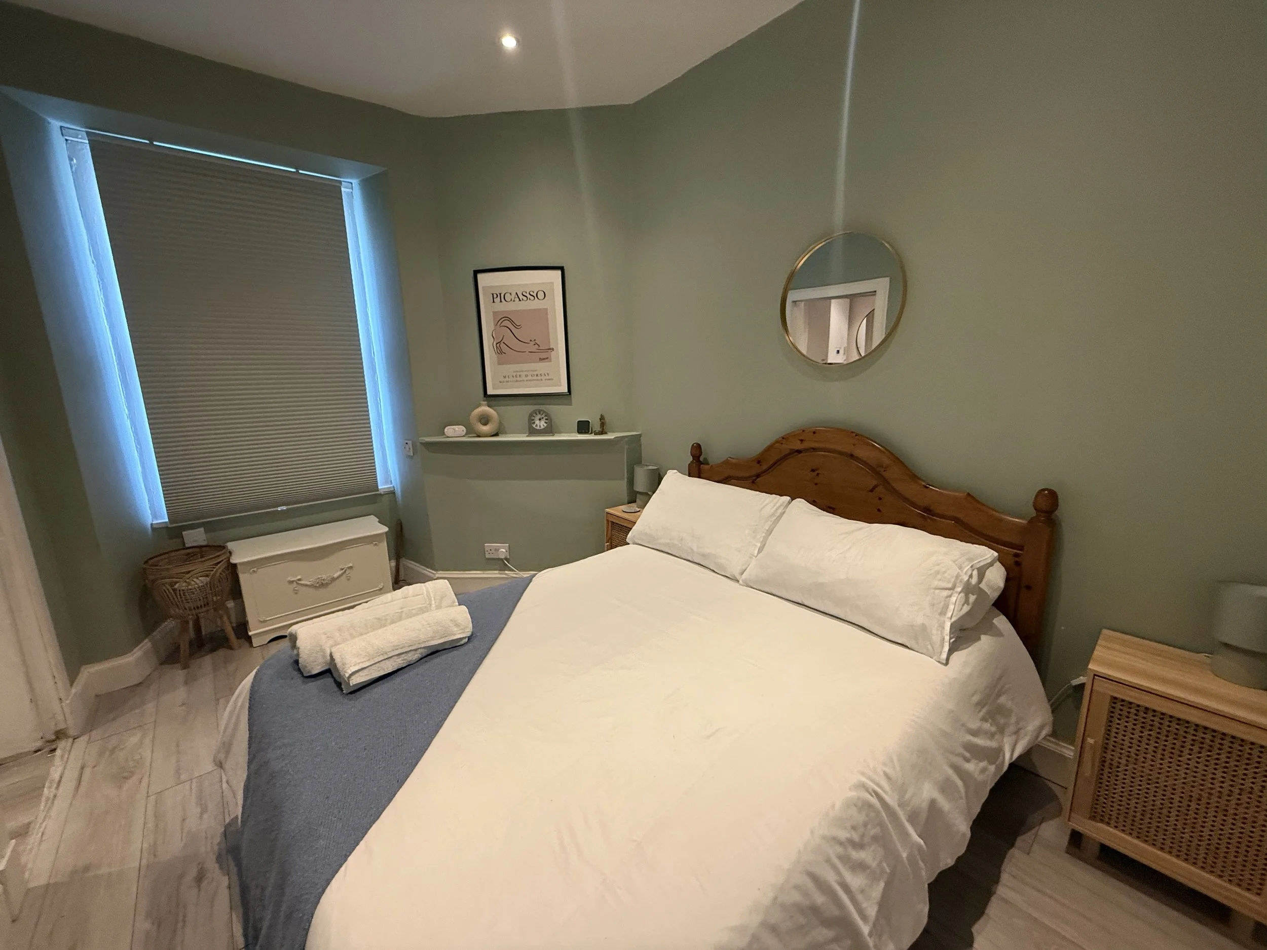 A cozy bedroom with a double bed, wooden headboard, white bedding, and two pillows. The bed has folded towels on it. There is a window with closed blinds, a framed Picasso artwork on the wall, a small round mirror, a wicker side table, and a white ch