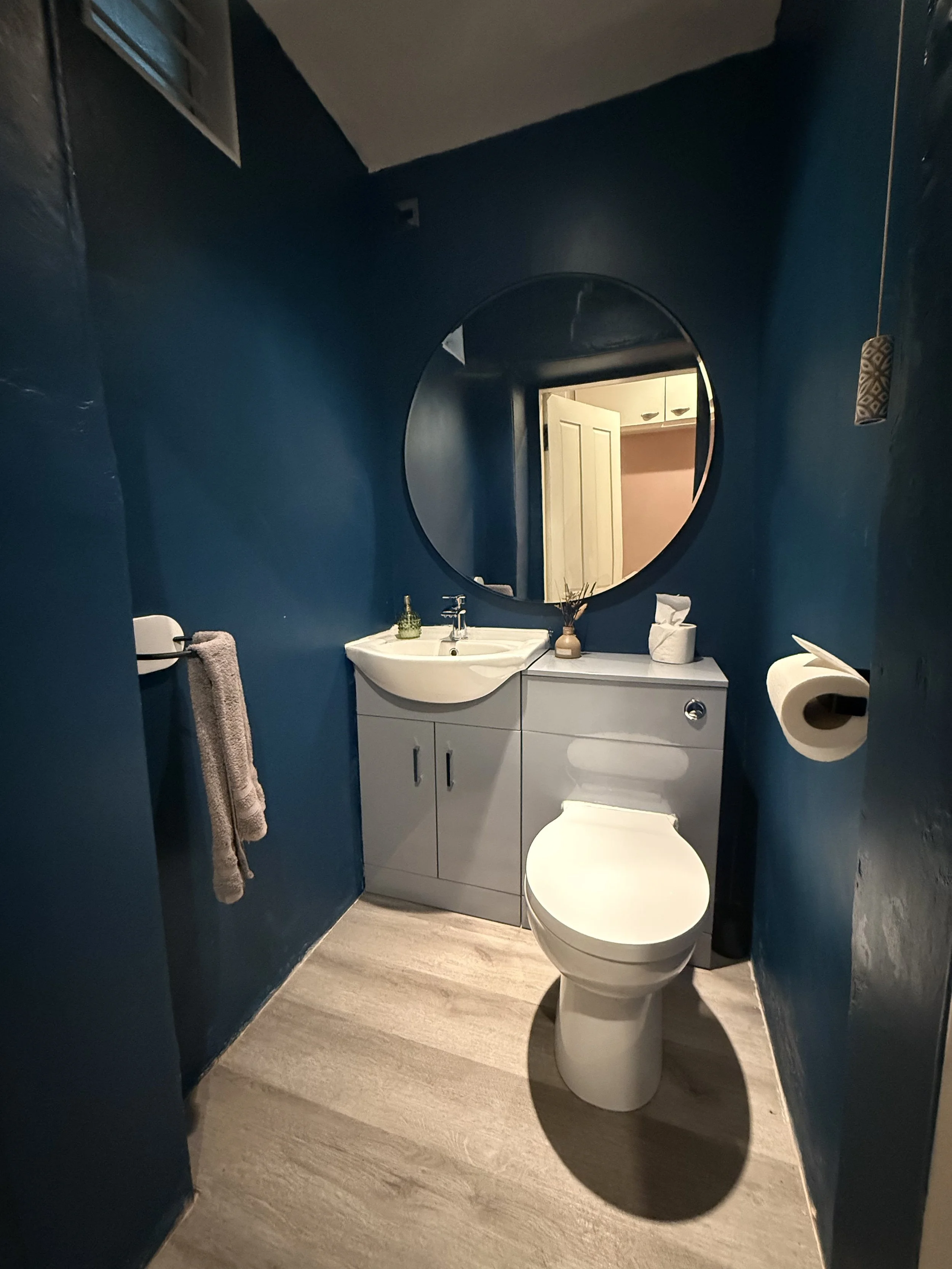 Small bathroom with dark blue walls, a white toilet, a gray cabinet with a sink, a large round mirror above the sink, and a beige rug on a wooden floor.