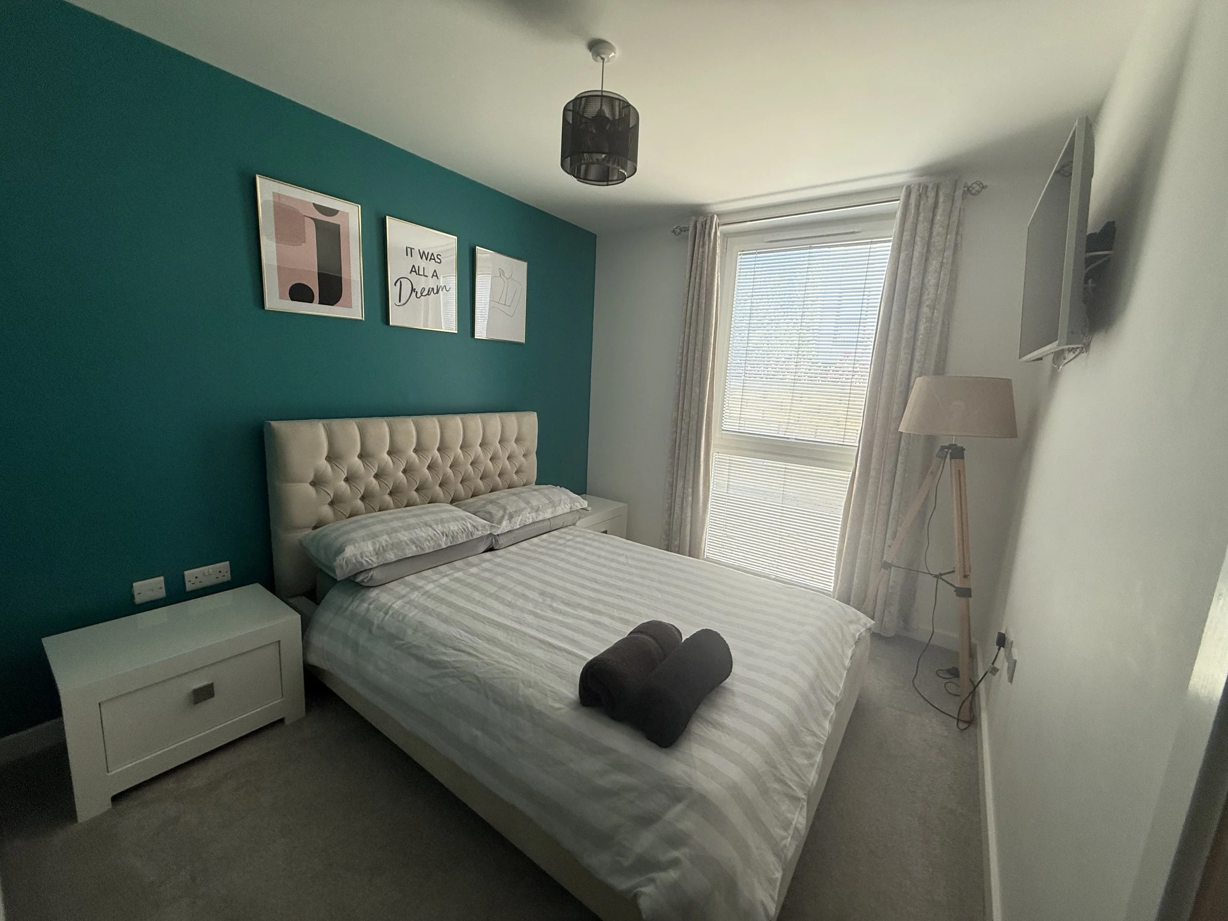 A bedroom with a teal accent wall, a neatly made bed with a tufted beige headboard, white side tables, and framed wall art above the bed. There is a window with blinds and curtains, a floor lamp, and a TV mounted on the wall. Two dark folded towels a