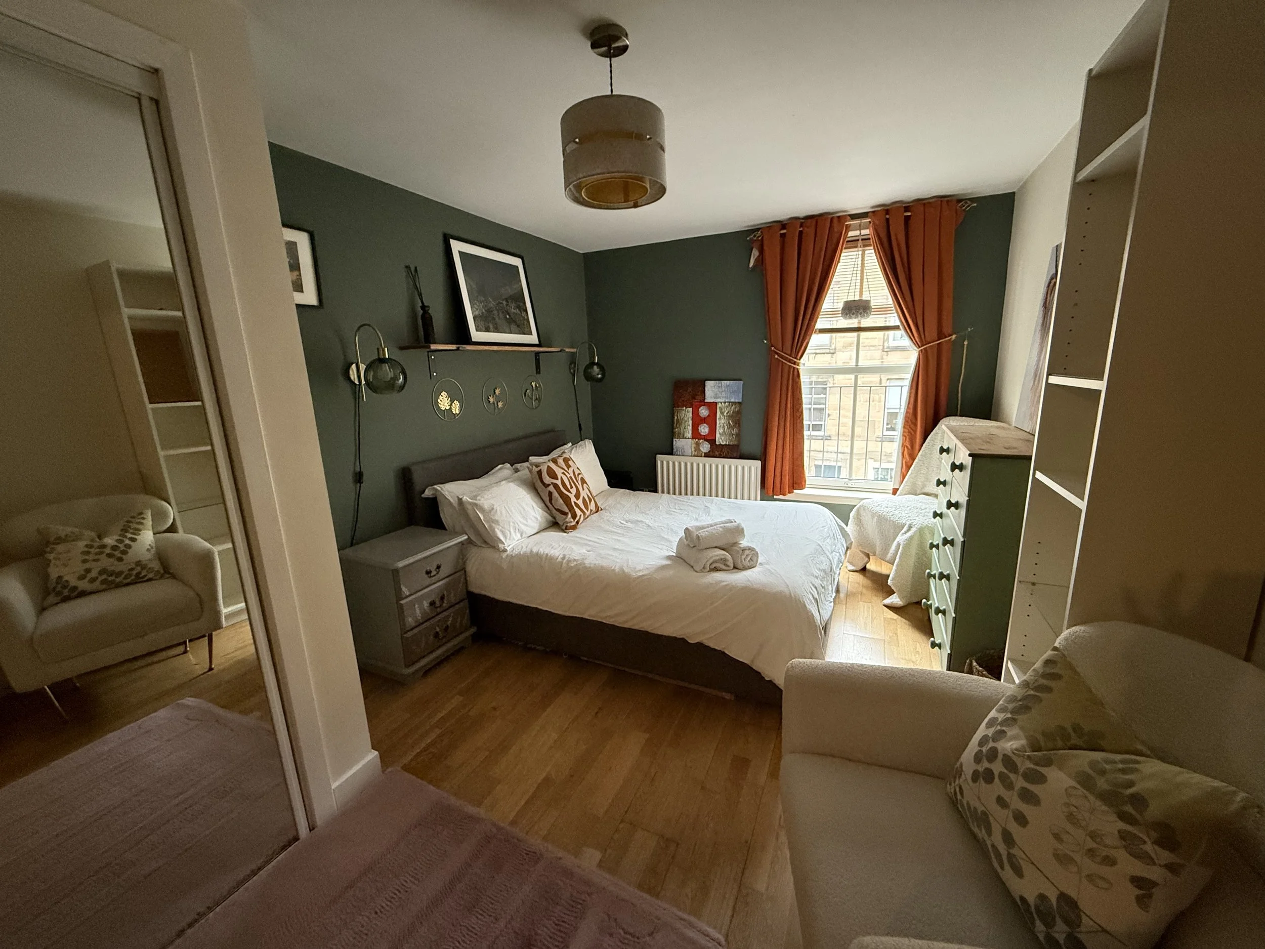 A cozy bedroom with a bed, nightstands, armchair, dresser, and window with orange curtains.