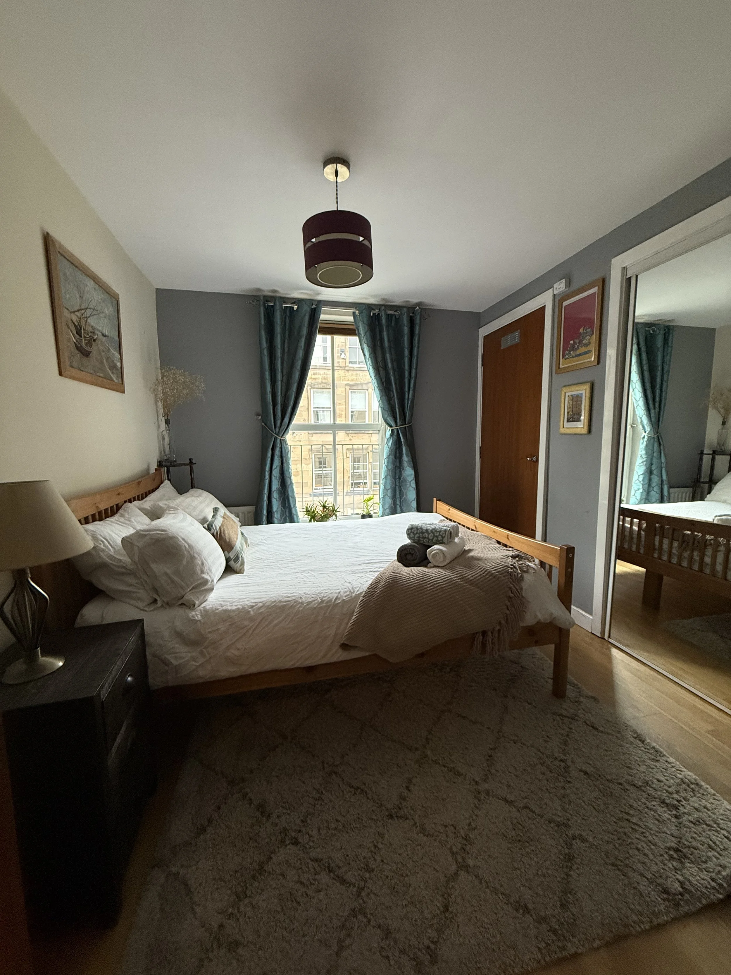 A cozy bedroom with a wooden bed, white bedding, rolled towels on the bed, a nightstand with a lamp, a window with blue curtains, and a closet with mirrored sliding doors.