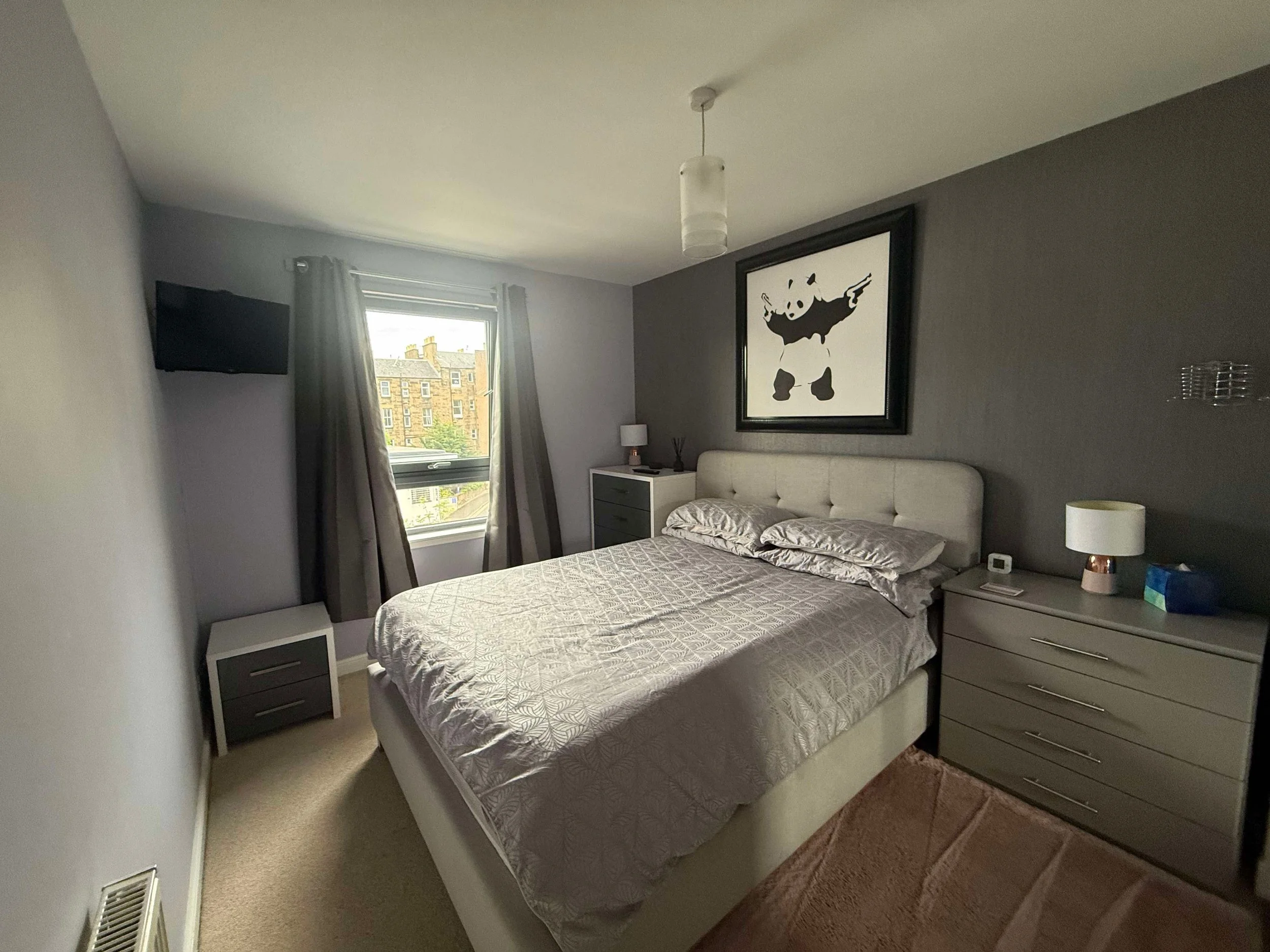 A bedroom with a large bed, dresser, small nightstand, wall-mounted TV, and a window with curtains, decorated in neutral tones with a panda artwork above the bed.