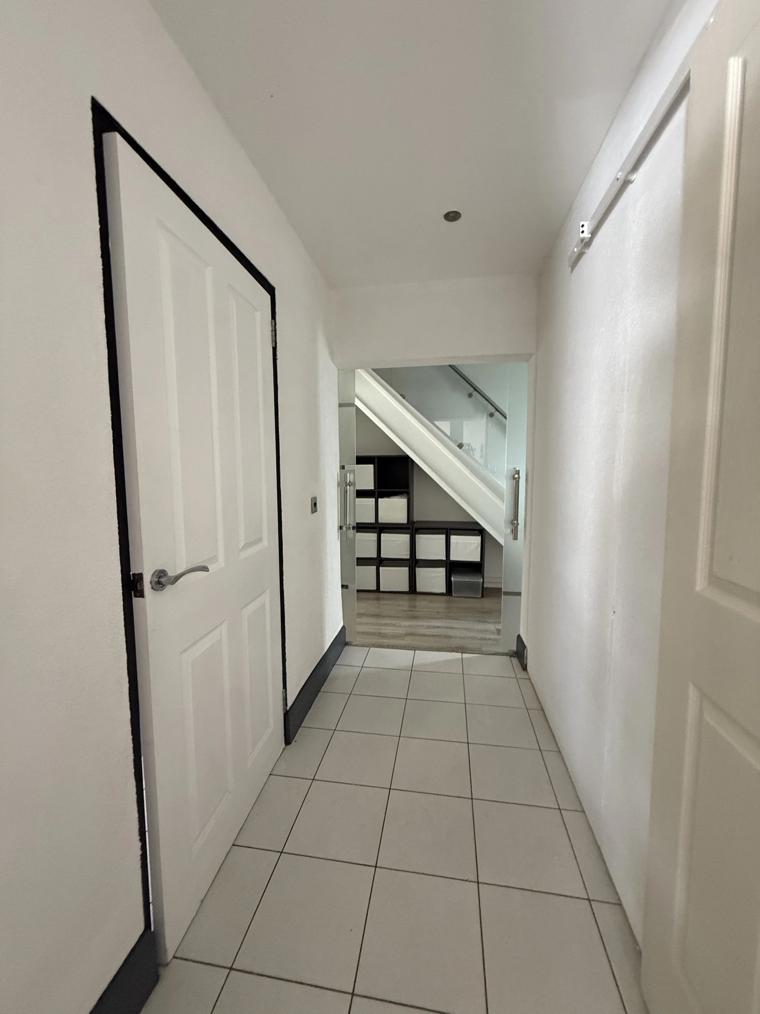 Hallway with white walls, tiled floor, and a door on the left, leading to a room with a staircase and black shelving unit in the background.