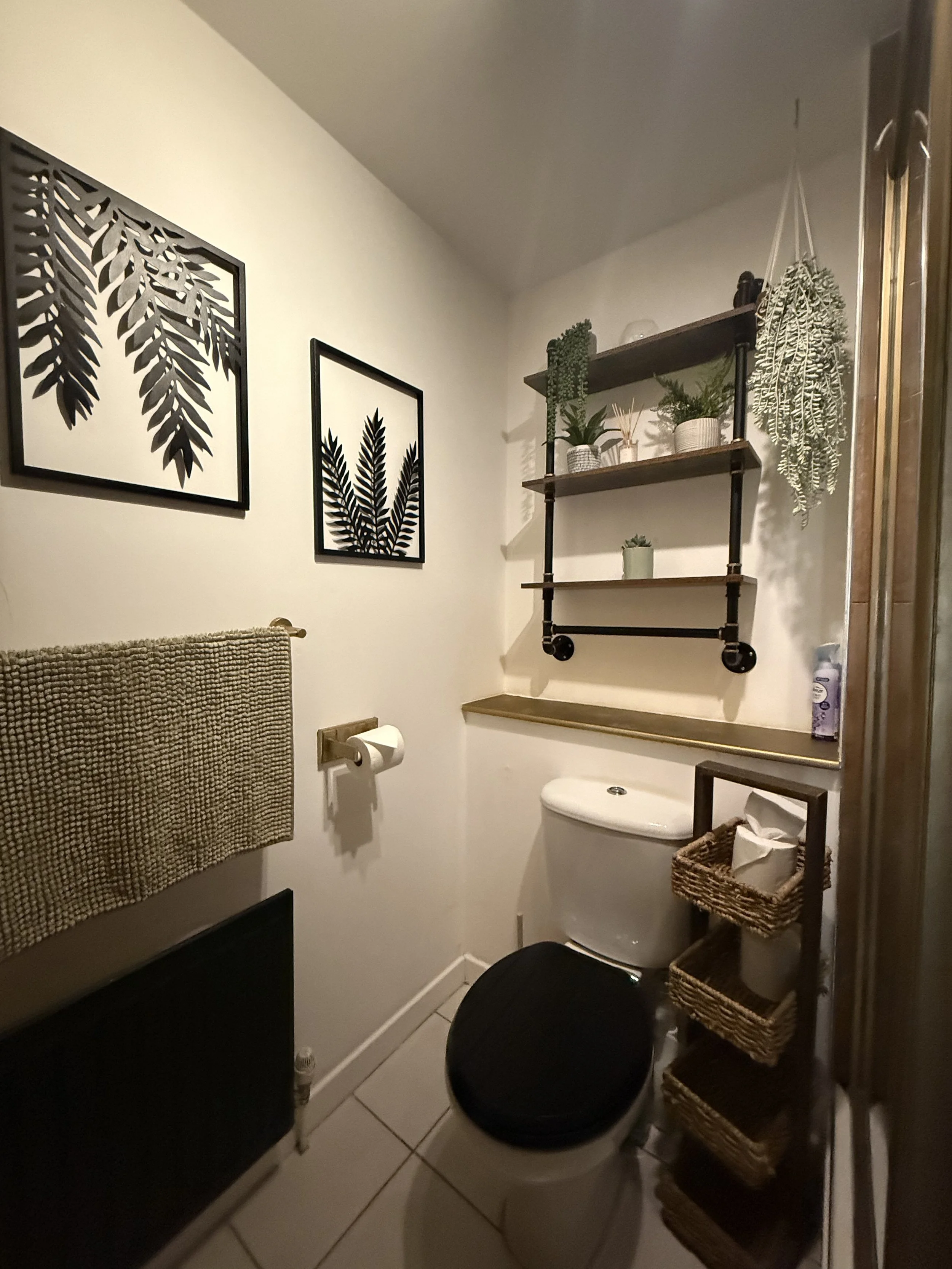 A small bathroom with framed black and white leaf art on the wall, a toilet with a black lid, a woven basket stand with tissues, a woven towel on a gold towel bar, and shelves with potted plants.