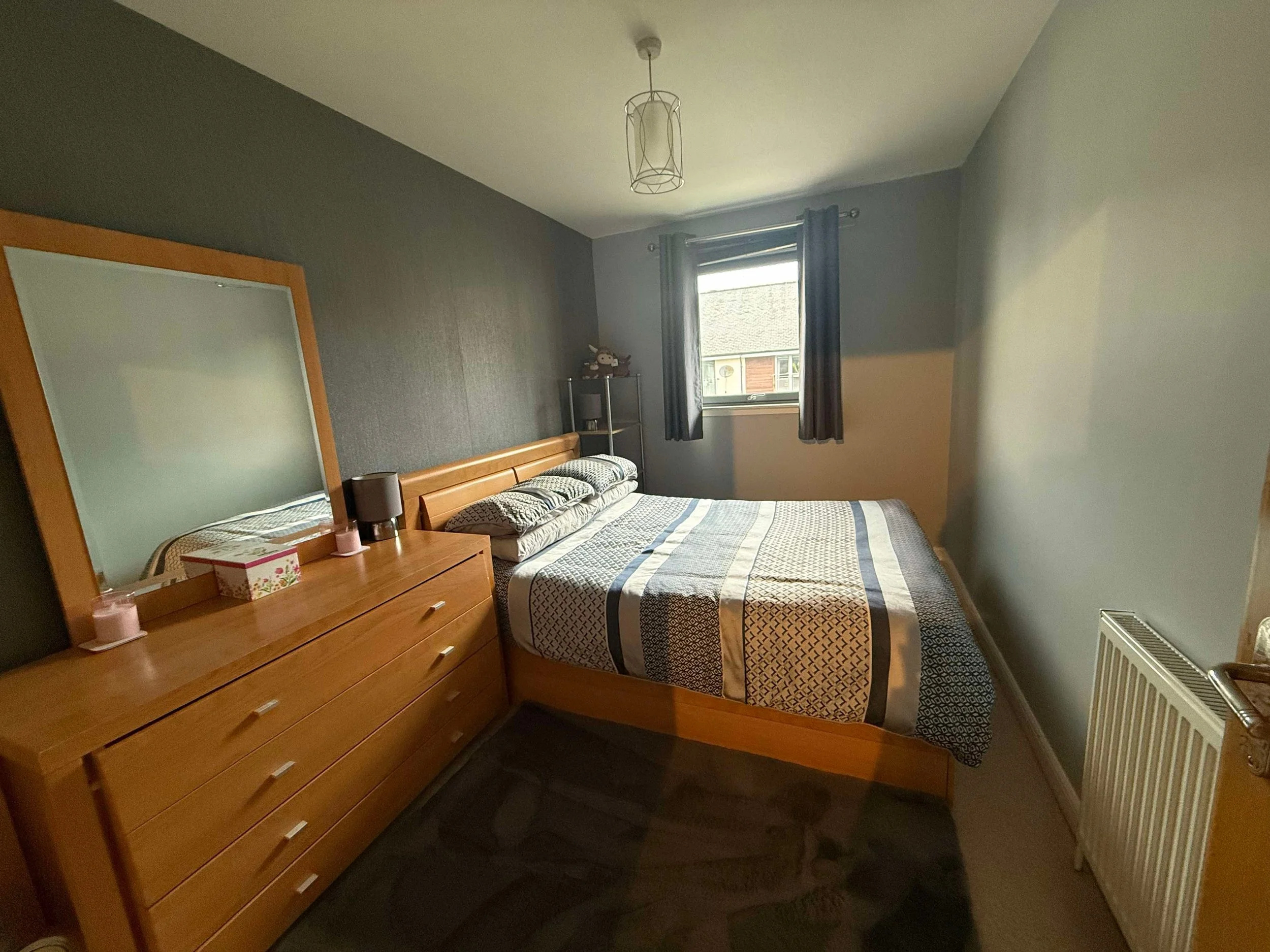 A small bedroom with a wooden dresser and mirror, bed with patterned bedspread and pillows, window with curtains, radiator, and ceiling light fixture.