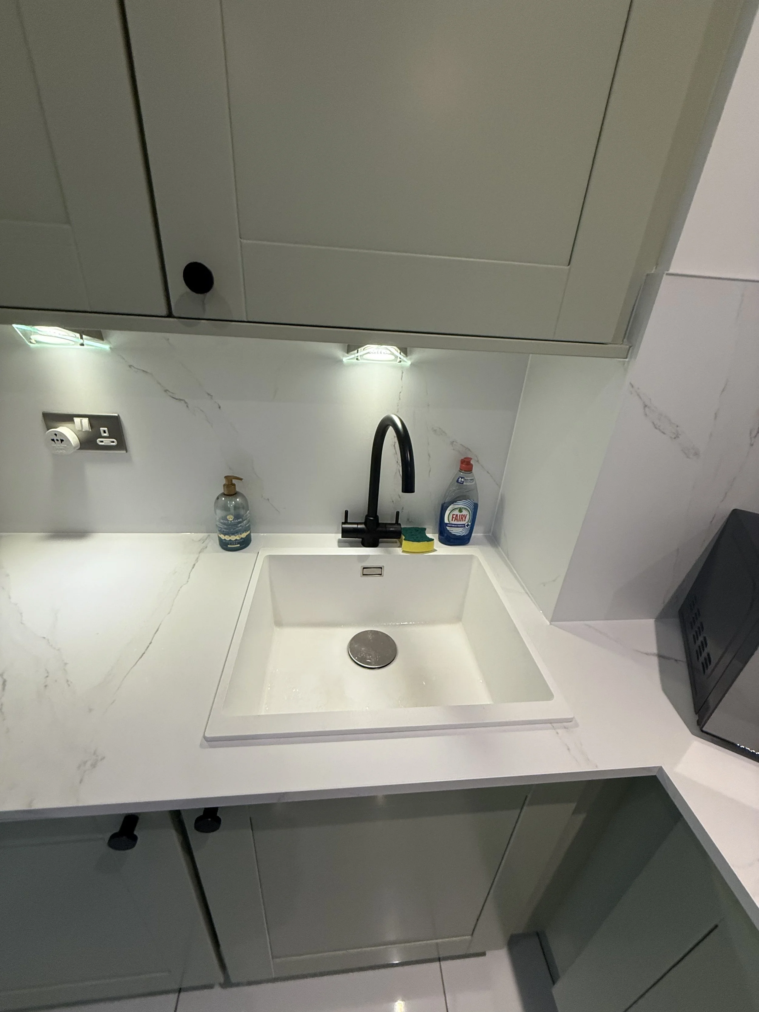 A kitchen sink area with a black faucet, soap dispenser, dish soap bottle, sponge, and under-cabinet lighting.
