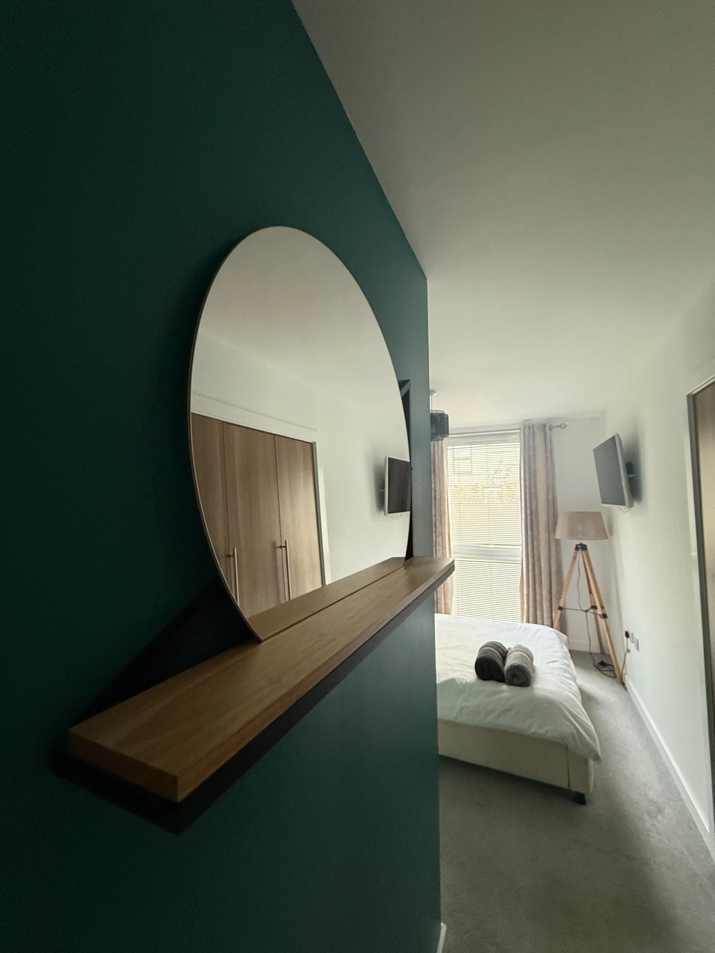 A bedroom with a large mirror on a teal wall, a bed with folded towels, a window with curtain, a tripod lamp, and a flat-screen TV.